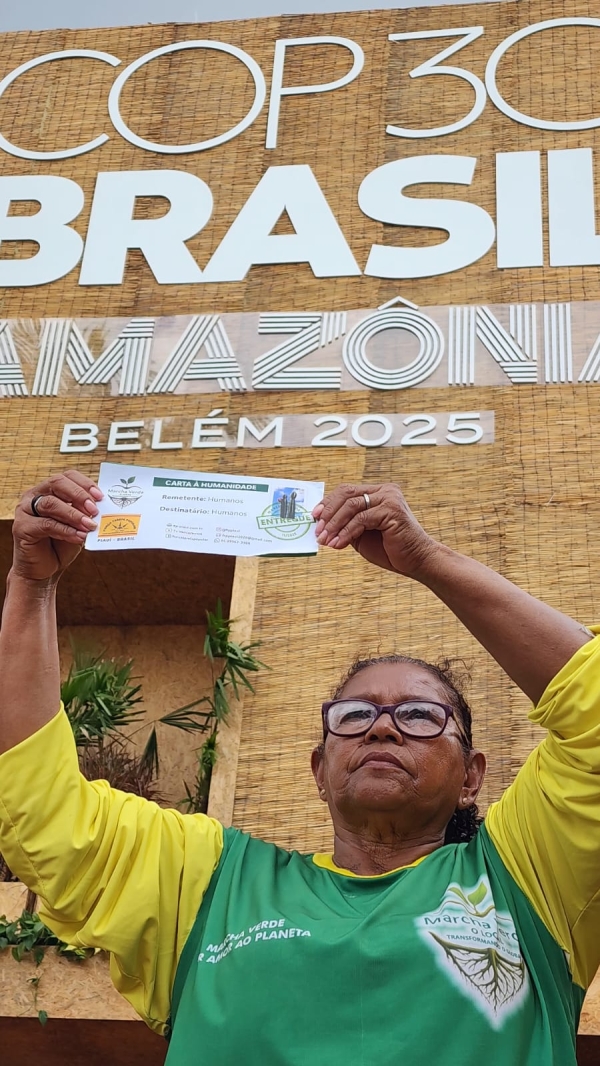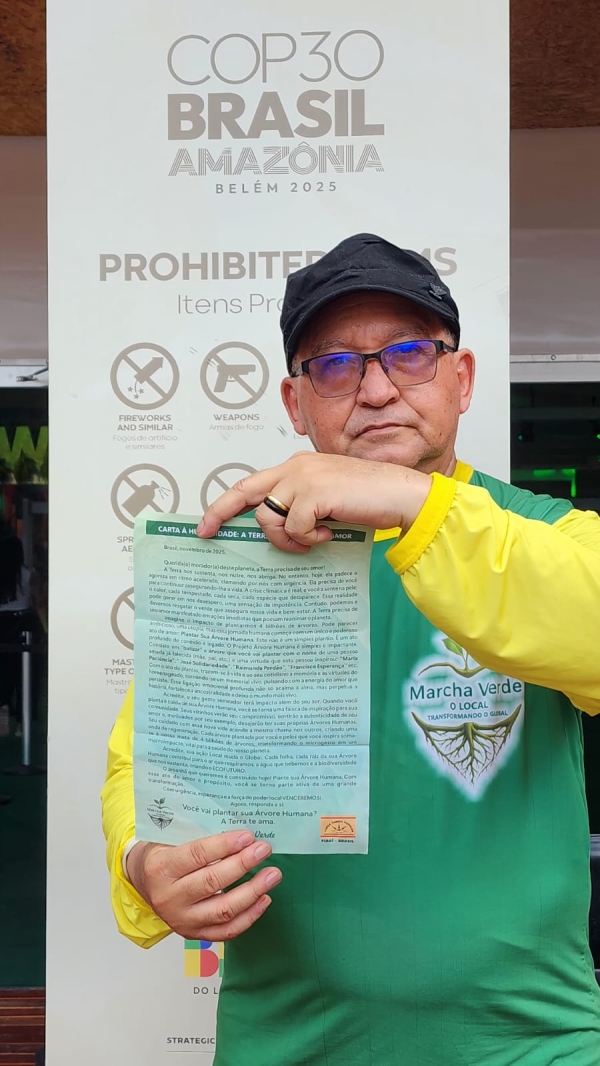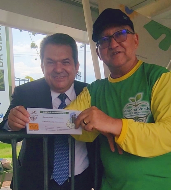 A Marcha Verde marca presença na 30ª COP30, em Belém do Pará, com a entrega de um documento estratégico que posiciona `s ação climática: a Carta à Humanidade. O coordenador da Força-Tarefa Popular (FTP) e da Marcha Verde, Arimateia Dantas, entregou junto com o grupo de marchantes a "Carta à Humanidade" diretamente para os participantes e organizadores da COP30, entre eles o presidente da Assembleia Legislativa do Estado do Pará (Alepa), deputado Chicão e também a primeira-dama do Pará, Daniela Barbalho, esposa do governador Helder Barbalho (MDB).