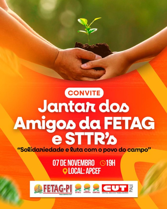 Com o tema “Solidariedade e luta com o povo do campo”, o movimento sindical urbano, em parceria com secretarias de Estado, realiza o Jantar dos Amigos da Federação dos Trabalhadores Rurais Agricultores e Agricultoras Familiares do Estado do Piauí (FETAG-PI) e de seus Sindicatos de Trabalhadores e Trabalhadoras Rurais (STTR’s). A Força-Tarefa Popular (FTP-PI) apoia essa importante iniciativa.