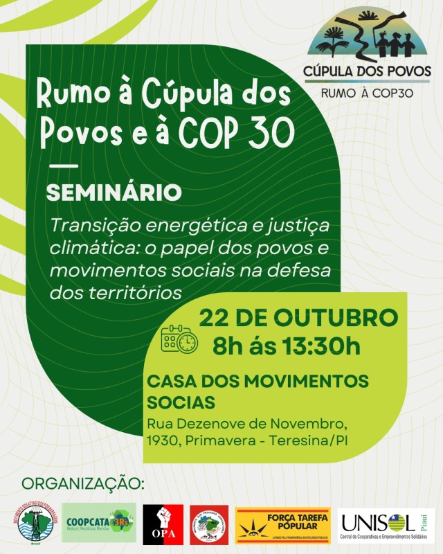No próximo dia 22 de outubro, Teresina será palco do seminário “Transição energética e justiça climática: o papel dos povos e movimentos sociais na defesa dos territórios”, que acontecerá das 8h às 13h30, na Casa dos Movimentos Sociais (Rua Dezenove de Novembro, 1930 – bairro Primavera).