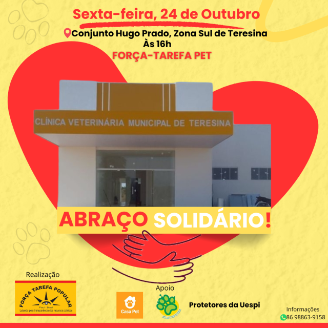 A Força-Tarefa Popular (FTP-PI) se une a protetores e ativistas da causa animal para realizar, na sexta-feira (24), às 16h, o “Abraço Solidário” na Clínica Veterinária Municipal de Teresina, localizado no Conjunto Hugo Prado, Zona Sul da Capital. O ato visa mobilizar a sociedade, o poder público e chamar atenção para a situação de abandono da obra e para a necessidade urgente de inauguração da unidade, prometida desde 2021.